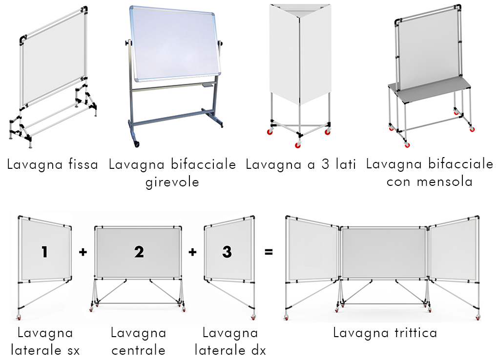 I pannelli delle lavagne sono verniciati color bianco e possono essere montati fissi o girevoli, a seconda dell’utilizzo come lavagna standard o come lavagna bifacciale.