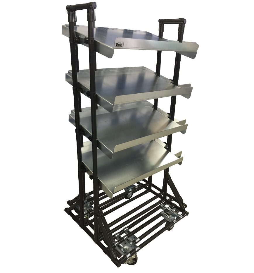 I carrelli portamateriali ergonomici Utek sono utilizzati per l'impiego sulla postazione di lavoro di un elevato numero di varianti, un alternativa alla messa disposizione fissa. Vengono configurati per la messa a disposizione di materiali in pallet, cassette o contenitori di prelievo riducendo inutili sforzi e aumentando la produttività. Possono essere dotati di sistema di traino o maniglione per il trasporto dei materiali dal supermarket al posto di lavoro o rimanere fissi in postazione come estensione della postazione di lavoro. I carrelli portamateriali sono realizzati con il sistema modulare, tutti i piani sono regolabili in altezza, profondità e inclinazione per facilitare la presa dei materiali. É il carrello portamateriali ad adattarsi alle esigenze di processo e non il contrario!