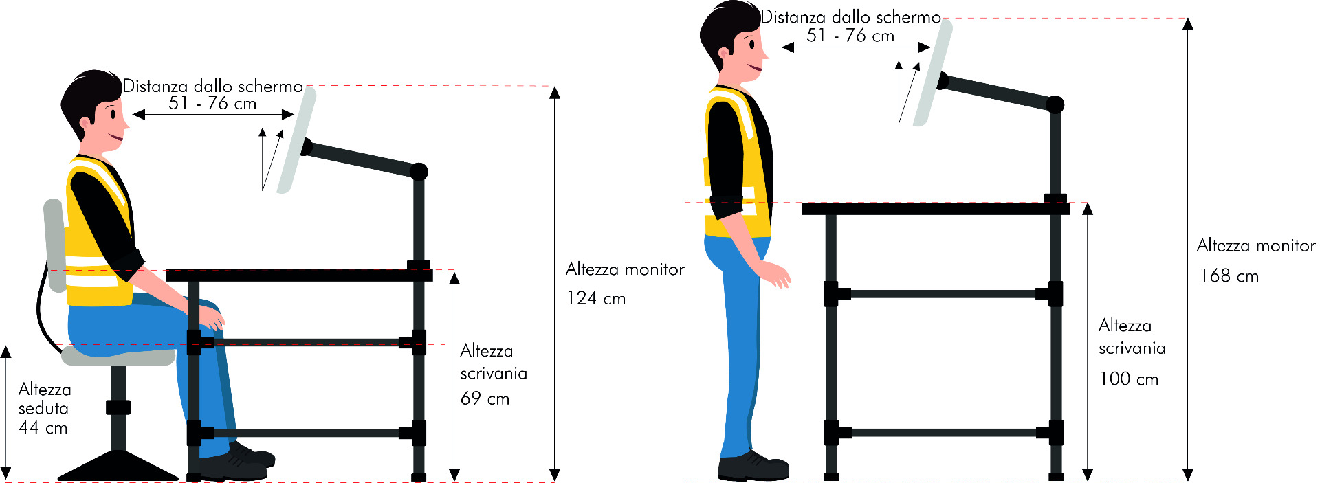 Possiamo considerare come altezza media ottimale 98 cm per postazioni di lavoro in piedi e seduti per attività leggere.