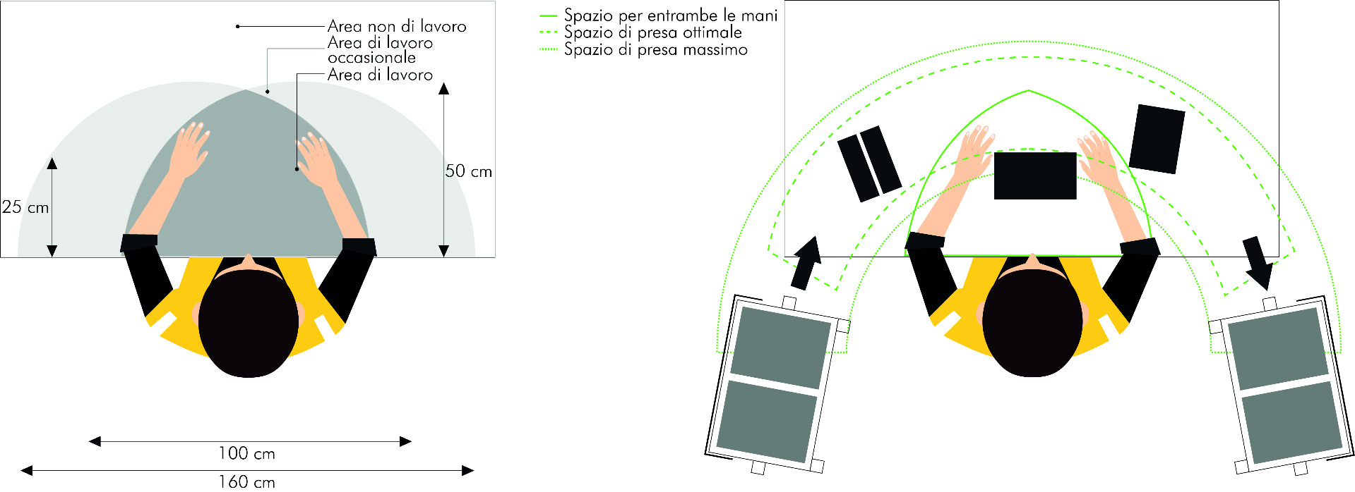 - Campo di presa ottimale, è l'area raggiungibile con il braccio piegato, è la posizione degli strumenti e i contenitori dei materiali solitamente afferrati con una mano.
