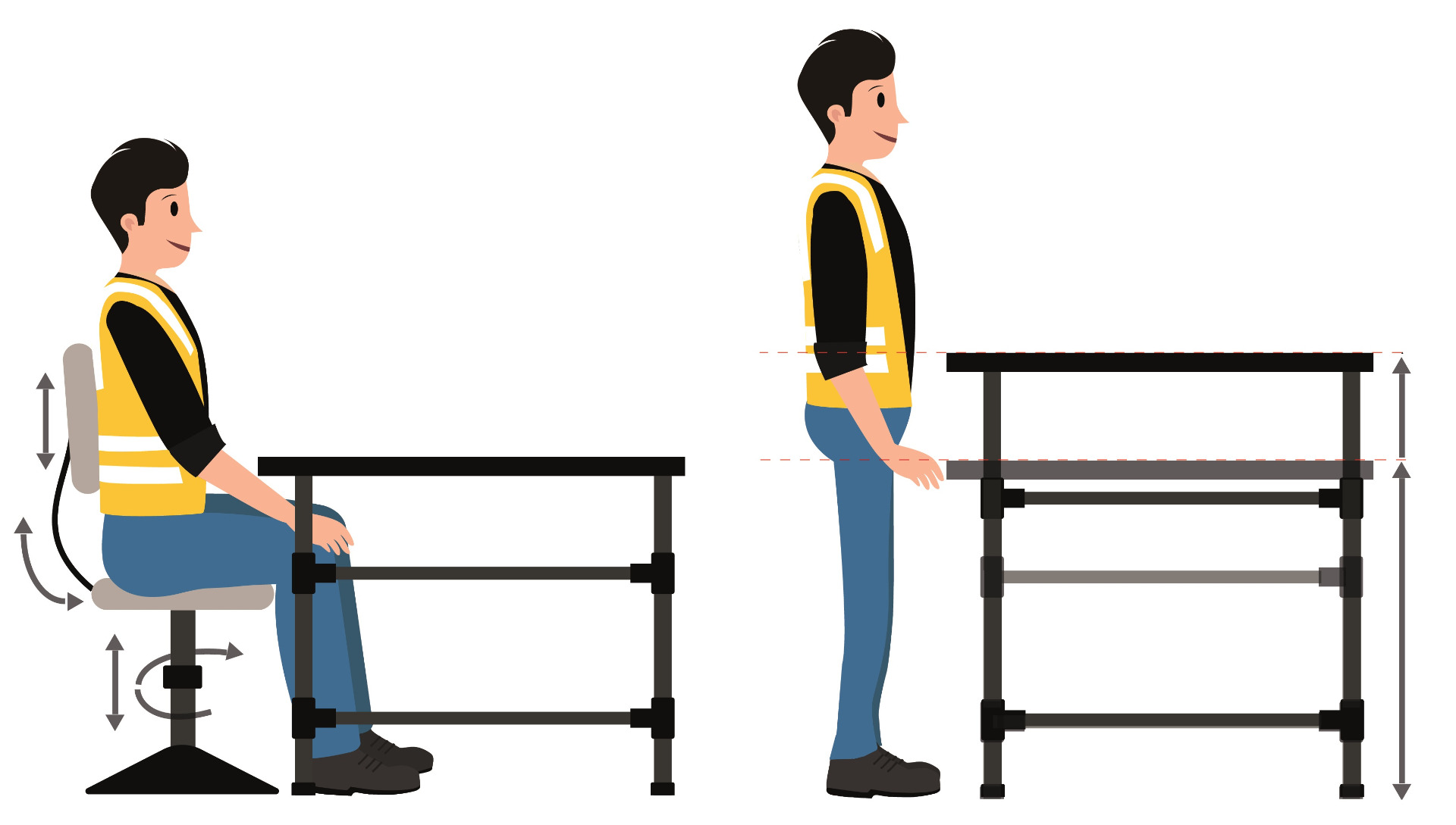 Che si tratti di una stazione di montaggio, di controllo qualità, lavorazioni o una workstation per altre attività, è necessario decidere se l'operatore sarà più efficace in piedi o seduto. Hai bisogno di una postazione in piedi / in movimento o in piedi / seduti o entrambe? Favorisci l'alternarsi di attività dinamiche per contrastare uno dei problemi più comuni nel montaggio manuale a causa della rigidità posturale a cui è associata l'attività di montaggio manuale provoca rapidamente dolori alla schiena. Ma se l'operatore lavora in modo ergonomico a un tavolo di lavoro regolabile elettricamente in altezza prima d'iniziare potrà adattarlo alla propria statura e se necessario passare dalla posizione in piedi a quella seduta e viceversa per ridurre l'affaticamento muscolo-scheletrico sul operatore e ne aumentano l'efficienza.