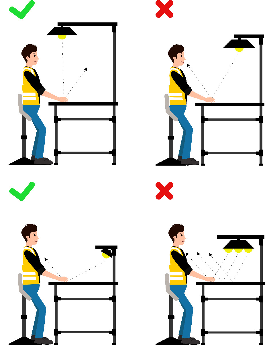 A seconda del proprio ambiente, è estremamente importante una buona illuminazione con luce bianca calda per ridurre l'affaticamento, il rischio di errore e aumentare la concentrazione e la prestazione del operatore. La luce LED deve essere sempre orientata verso la superficie di lavoro e dovrebbe essere installata almeno 80cm sopra la superficie di lavoro in posizione centrale evitando riflessi e bagliori. L'intensità luminosa dipende dal attività da svolgere, puoi considerare l'intensità luminosa standard 500lux, ma per determinati compiti visivi (montaggio di piccole parti, controllo qualità ecc….) sono necessari 1000-1500lux.