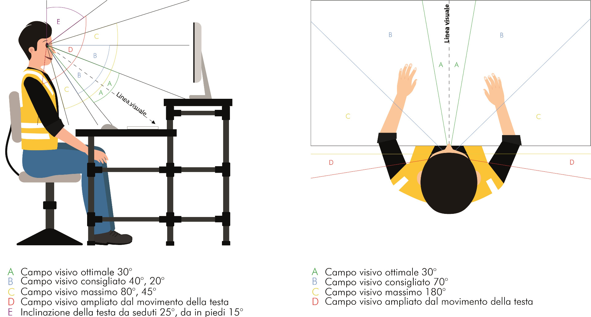 Per progettare un banco da lavoro efficiente è fondamentale considerare le raccomandazioni ergonomiche dei campi visivi: