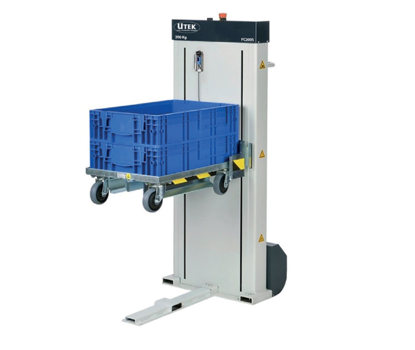 Sollevatore cassette elettrico KLT-Lifter con possibilità di regolazione individuale del l'altezza di lavoro ergonomica ideale per il posizionamento delle cassette in postazione di lavoro, evita il sollevamento manuale della cassetta a pieno carico. Compatibile con carrelli porta cassette milk-run 400x600mm.
