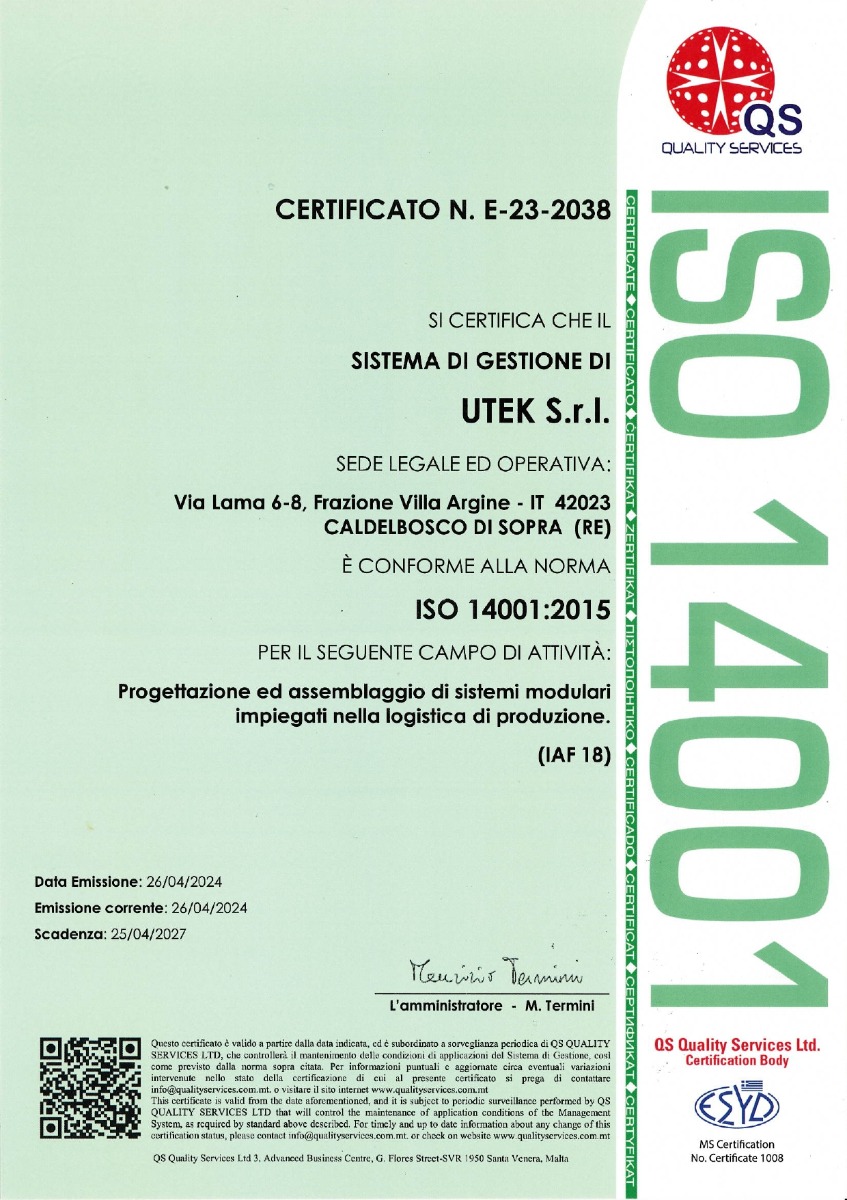 Siamo lieti di annunciare che Utek ha ottenuto la prestigiosa certificazione ISO 14001, un'importante testimonianza del nostro impegno per la sostenibilità ambientale.