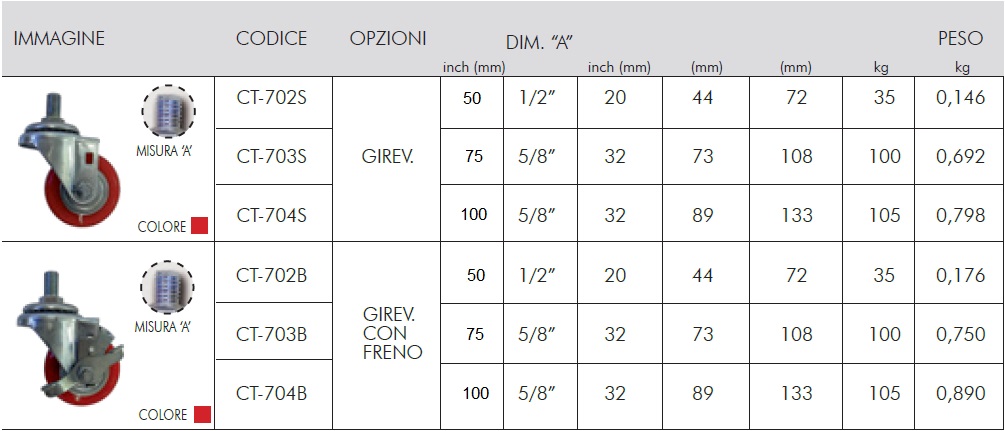 - Ruote con perno: per carrelli che devono percorrere tragitti brevi e trasportare carichi fino a 180 Kg