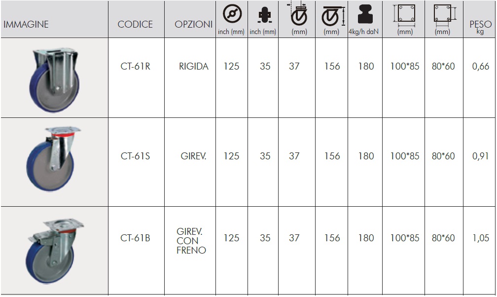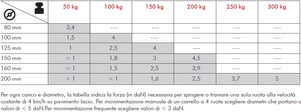 Di seguito ti allego due tabelle riportanti le specifiche e le capacità di carico di tutte le nostre tipologie di ruote: