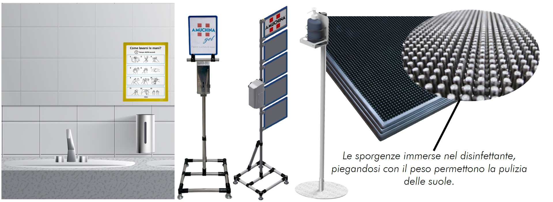 Sappiamo l'importanza dei gesti che dovremo sempre più adottare come riti di prevenzione per noi, come per la salvaguardia di colleghi e famigliari. Per questo motivo abbiamo deciso di dedicarci alla produzione di cartelli informativi su come igienizzare le mani, di stazioni di sanificazioni che mettano a disposizione gli strumenti per farlo e di accessori che agevolino il mantenimento della pulizia dei locali.
