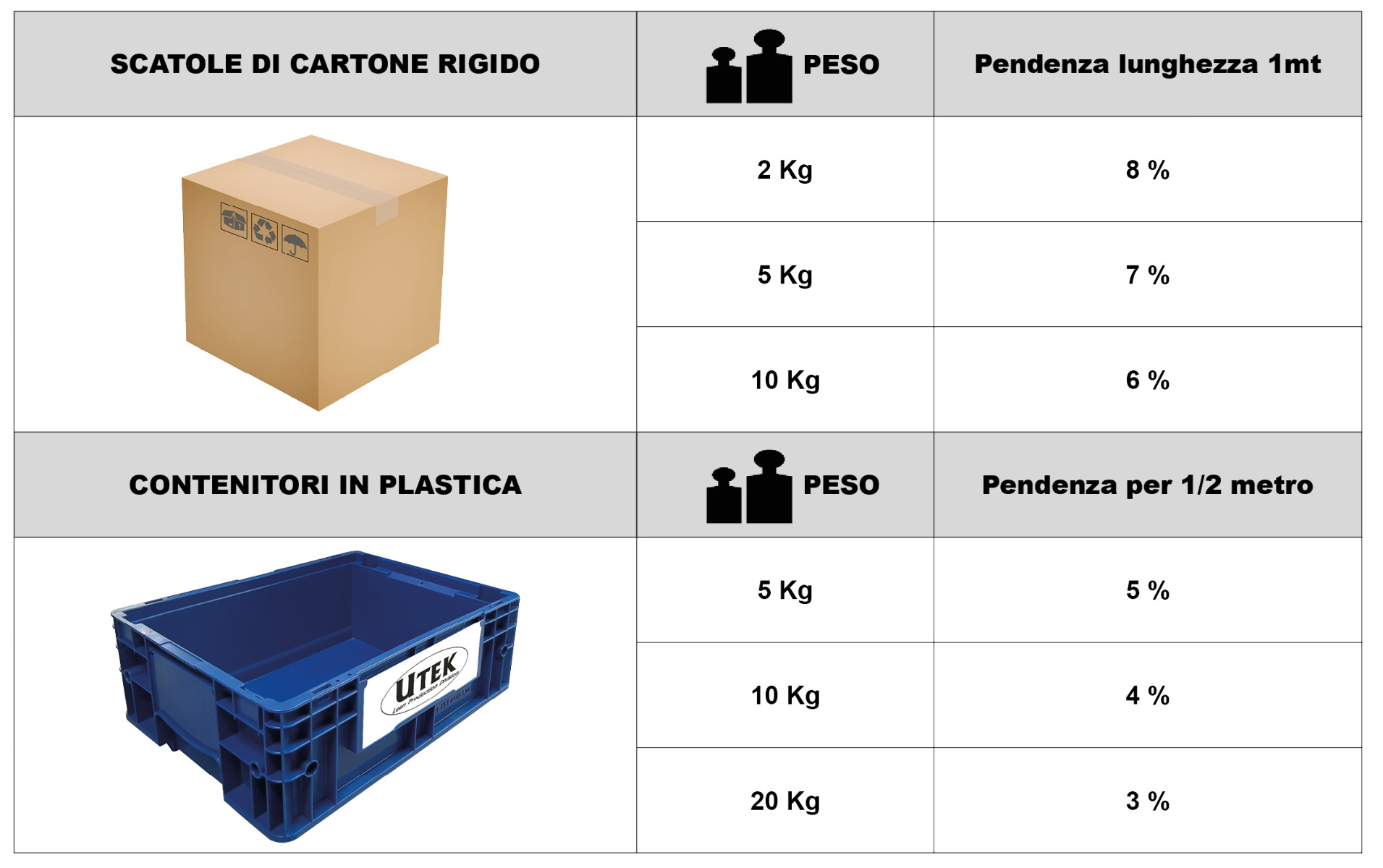 Tieni presente che i contenitori con fondo liscio scorrono più agevolmente sulle rulliere a gravità.