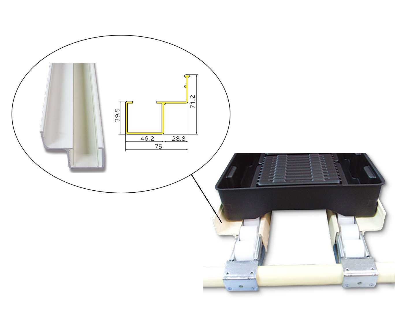 - PA401A Guida di contenimento centrale, a differenza della PA402B si aggancia direttamente sui traversi del flowrack in modo indipendente per ottenere una maggiore flessibilità per lasciare lo spazio necessario tra la guida e la rulliera.