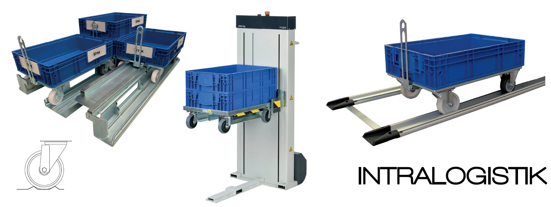 Intralogistik di Utek include il sollevatore KLT-Lifter, che solleva automaticamente le cassette all'altezza di lavoro desiderata, i carrelli porta contenitori Dolly in diverse dimensioni progettati per utilizzo individuale o in treni logistici Milk-Run o Tugger Train.