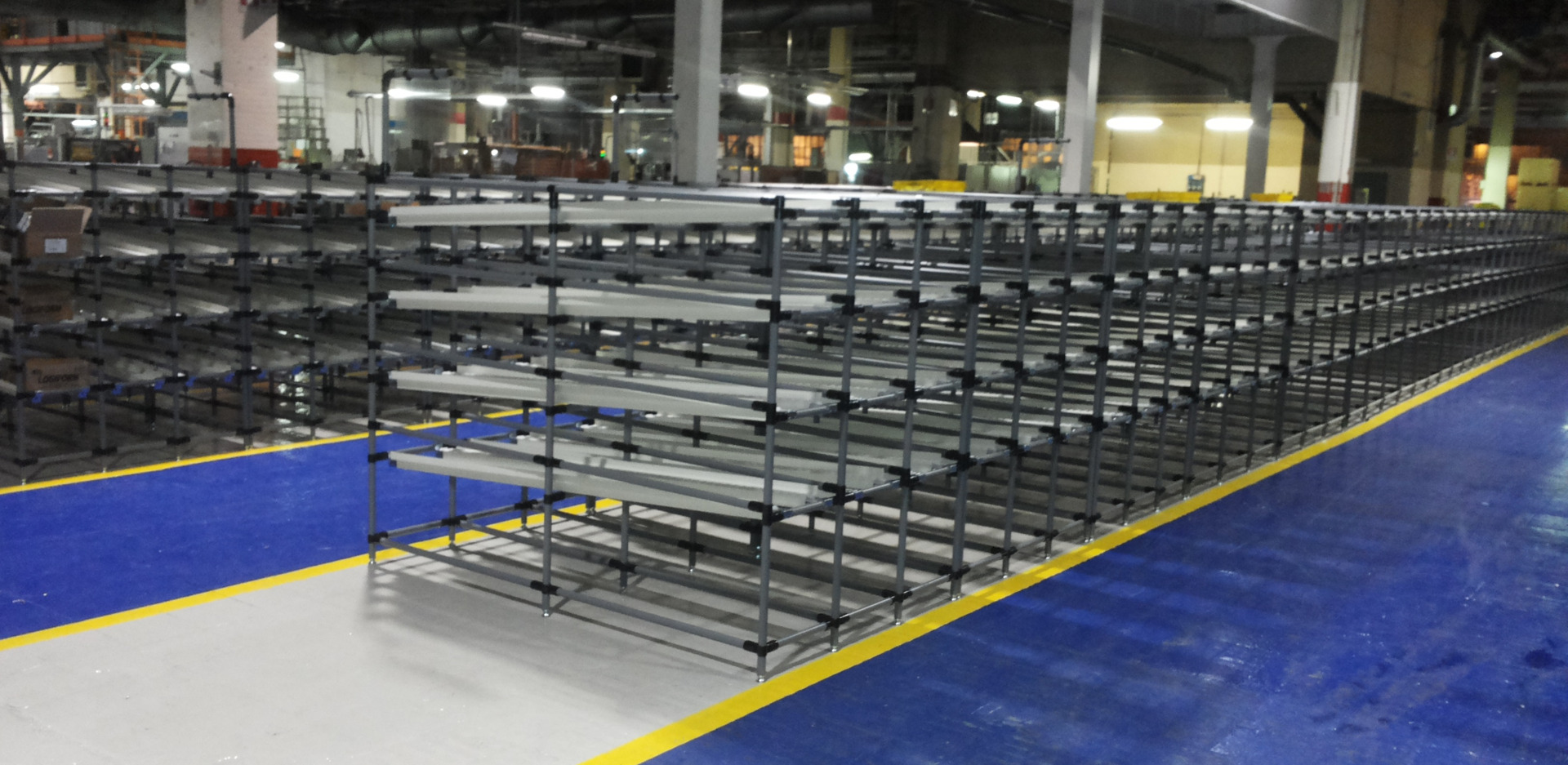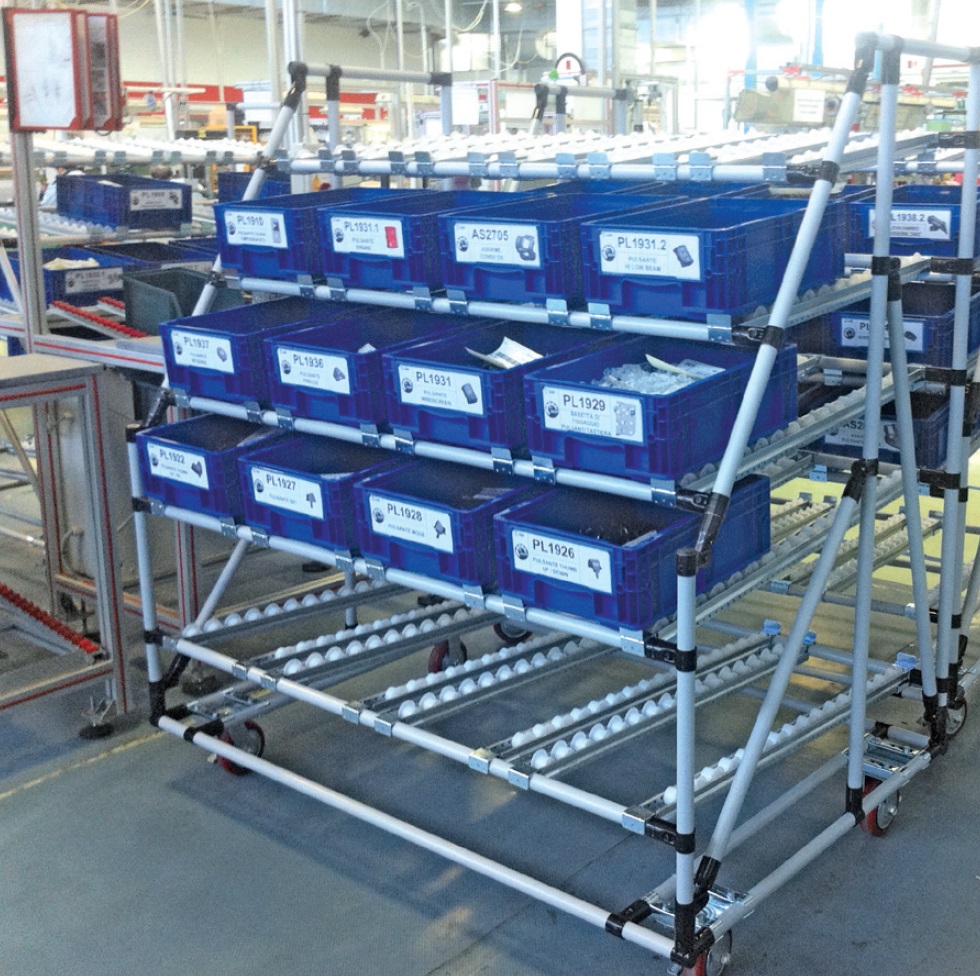 A destinazione, in postazione di montaggio è necessario un SAG o Supermarket completo di corsie scorrevoli o scivoli per la gestione FIFO delle parti. L’addetto all’asservimento linea caricherà dal retro i contenitori pieni e rimuoverà le cassette dalle corsie di ritorno vuote. Ogni corsia è assegnata a un unico componente.