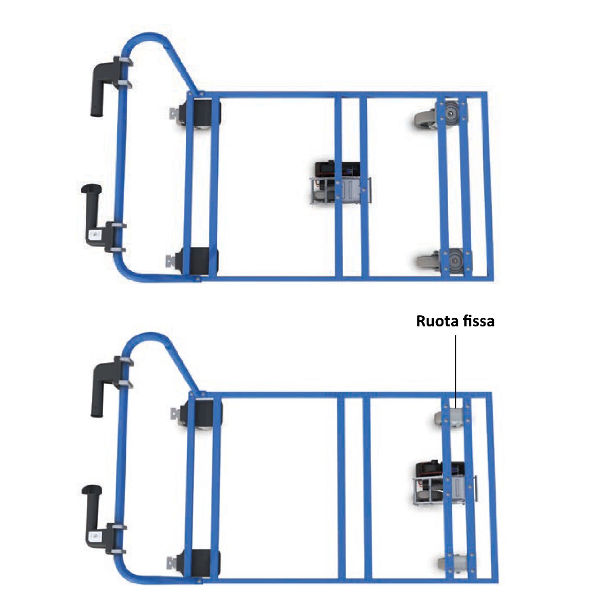 Il tutto con uno strumento che si adatta perfettamente sia con un carrello con 4 ruote girevoli sia con una combinazione mista. Quindi con due ruote fisse e due girevoli. In questo modo ogni soluzione è coperta. Quindi, è possibile rammodernare l'intero parco carrelli e renderli adatti a movimentazioni più complesse anche senza sostituire quelli che hai e che si muovono a spinta manuale.