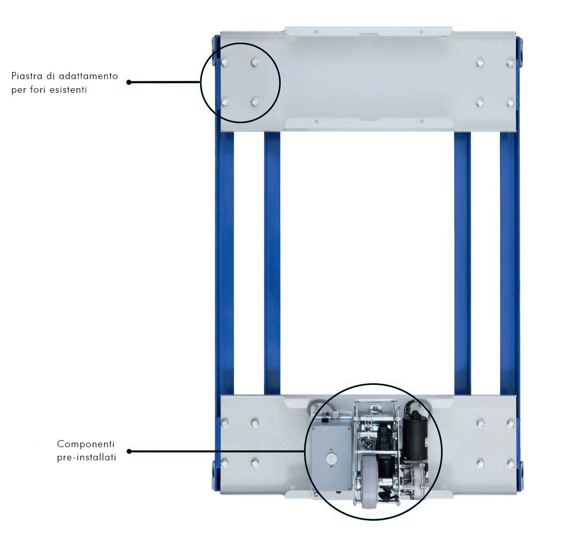 Con questo termine intendiamo un elemento supplementare dotato di una singola ruota in grado di essere integrato su necessità e in maniera semplice sotto al pianale di carrelli preesistenti utilizzati per spostamenti interni in aziende che hanno bisogno di muovere pacchi e oggetti pesanti lungo percorsi indoor ed esterni. Il sistema di montaggio è plug-and-play ovvero adattabile perché consente di fissare il kit motoruota integrandosi ai fori e alle piastre già presenti sulla struttura originale, facilitando l’operazione ed evitando modifiche strutturali dispendiose e lunghe.