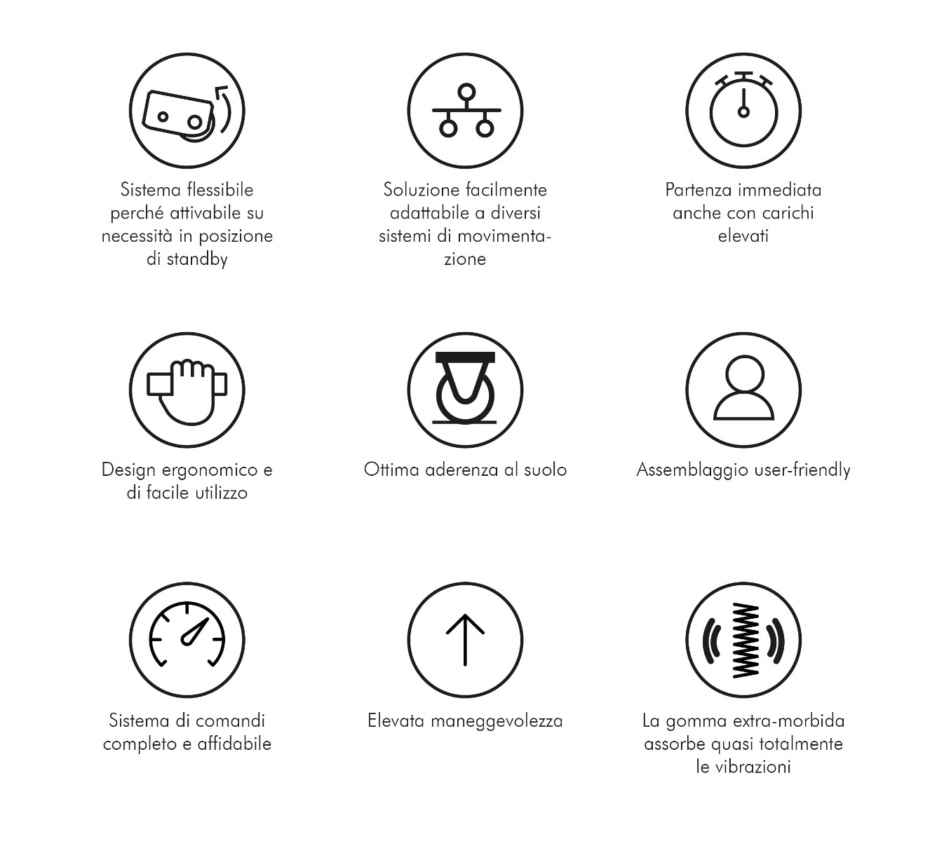 E’ un’applicazione dal design ergonomico, maneggevole e che annulla quasi totalmente le vibrazioni, grazie alle buone proprietà ammortizzanti. Inoltre la movimentazione è facilitata e si può manovrare facilmente anche in spazi ridotti dato che le ruote extra possono procedere anche a marcia indietro, regolando la velocità. Quando non serve, la quinta ruota può essere sollevata e permettere il movimento libero manuale.