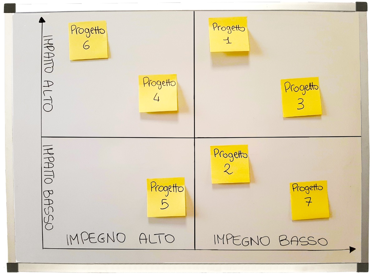 Ad esempio da quattro caselle magnetiche A3 sulle quali tenere traccia dello stato dei progetti attivi e a fianco allegare una lista degli altri lavori in attesa con matrice impatto-impegno che rappresenta l’ordine di priorità stabilito. Suddividendo così lo spazio visivo, anche la gestione dei progetti lean risulta più efficiente.